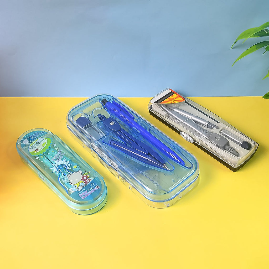 This 1 Pc Mix Design Geometry Compass Set offers a variety of stylish and functional compass kits perfect for school-going children and students. Each set includes essential mathematical instruments such as a compass, pencil, divider, and ruler, all housed in a compact and durable plastic box.